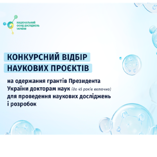 Відповідно до Указу Президента України від 14 травня 2024 року № 324/2024 Національний фонд досліджень України повідомляє про оголошення щорічного конкурсного відбору наукових проєктів для надання грантів Президента України докторам наук до 45 років (включно)...
